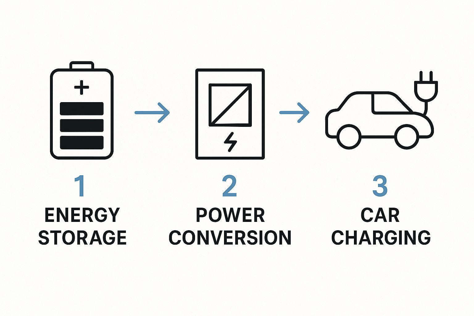 The image below breaks down the simple, three-step process of turning stored energy into a vehicle charge.