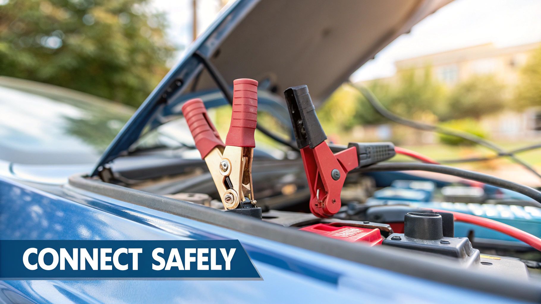 With your safety checks out of the way, it’s time to get the charger hooked up and bring your battery back to life. This part is pretty straightforward but the sequence really matters. Getting the order right is not just about being correct; it’s about protecting yourself and your car’s delicate electronics from a nasty shock.