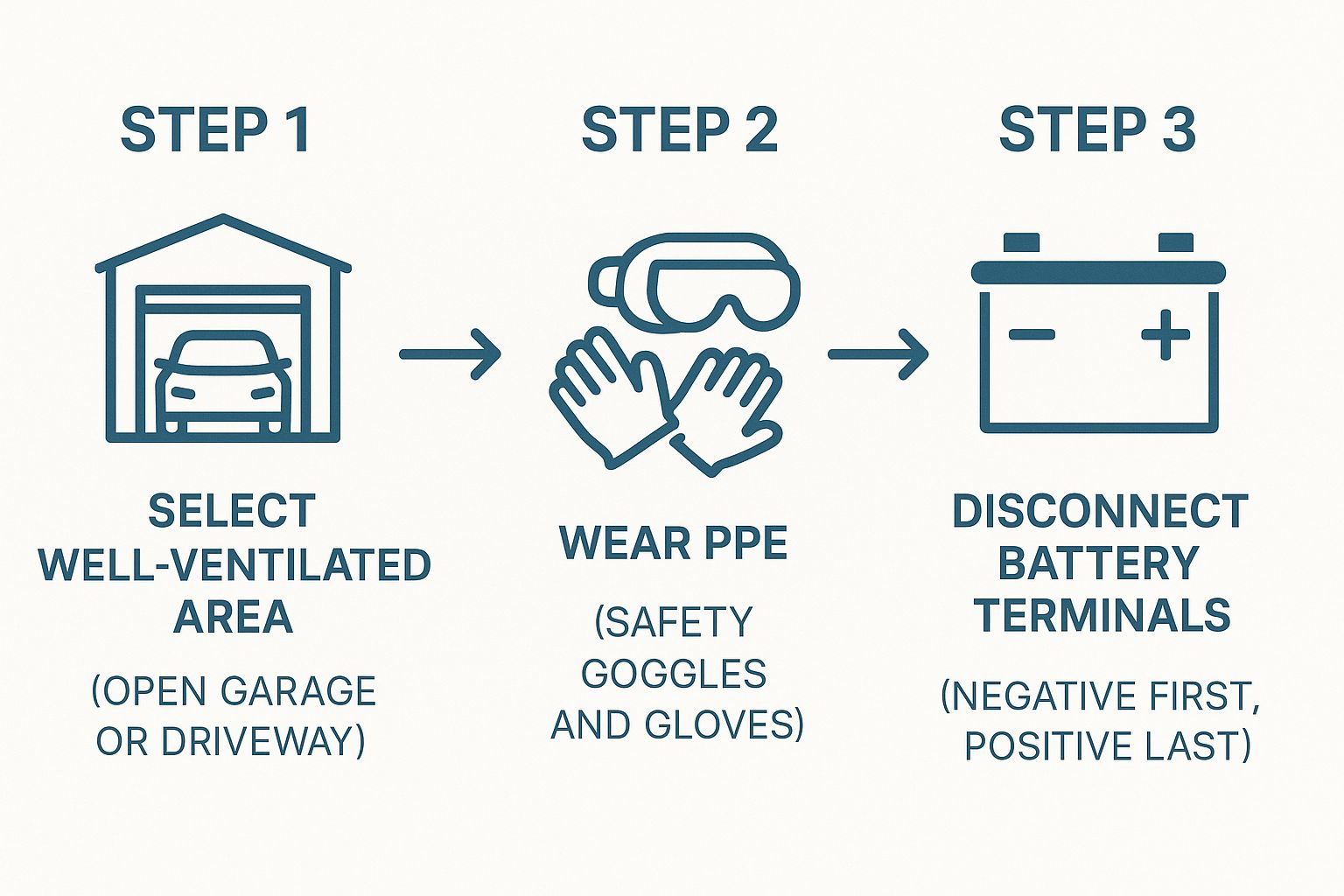 Before you even think about connecting a charger, getting the environment right is the most important step. Car batteries contain corrosive acid and can release flammable hydrogen gas while charging so treating them with respect is non-negotiable. Taking a few minutes to prepare properly minimises risks and makes sure the whole process goes smoothly.